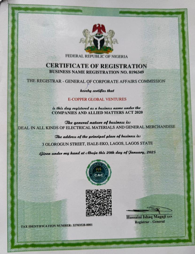 E-Copper Global Ventures is a specialist supplier of high-quality copper, earthing, cabling, transformer, and lightning protection products for industrial, commercial, and construction projects across Nigeria.